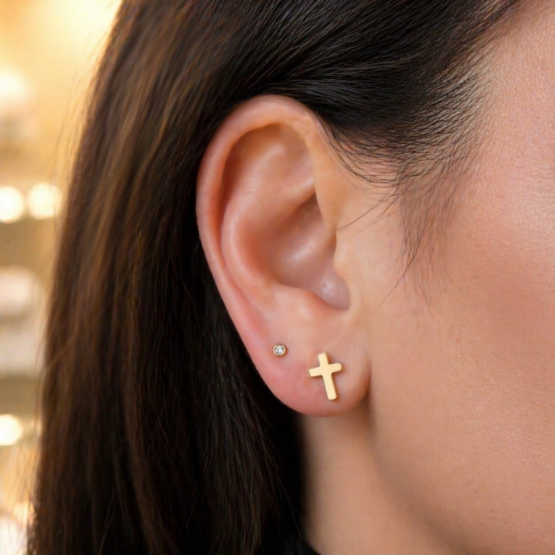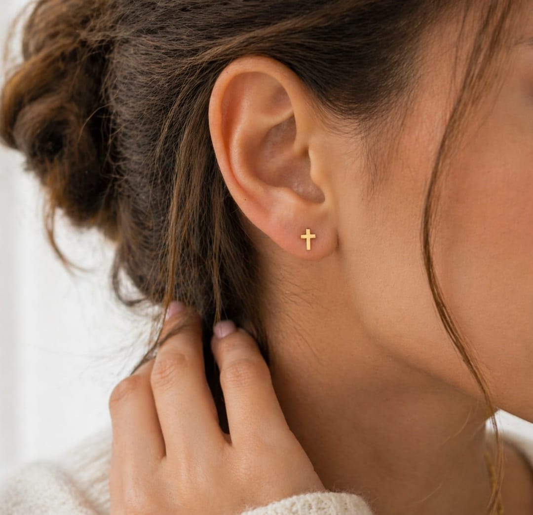 Cercei aur galben 14 k in forma de cruciulita cu inaltime de 9 mm, sistemul de prindere este prevazut cu tija si fluturas Bijuterii personalizate, realizate in atelierele noastre.